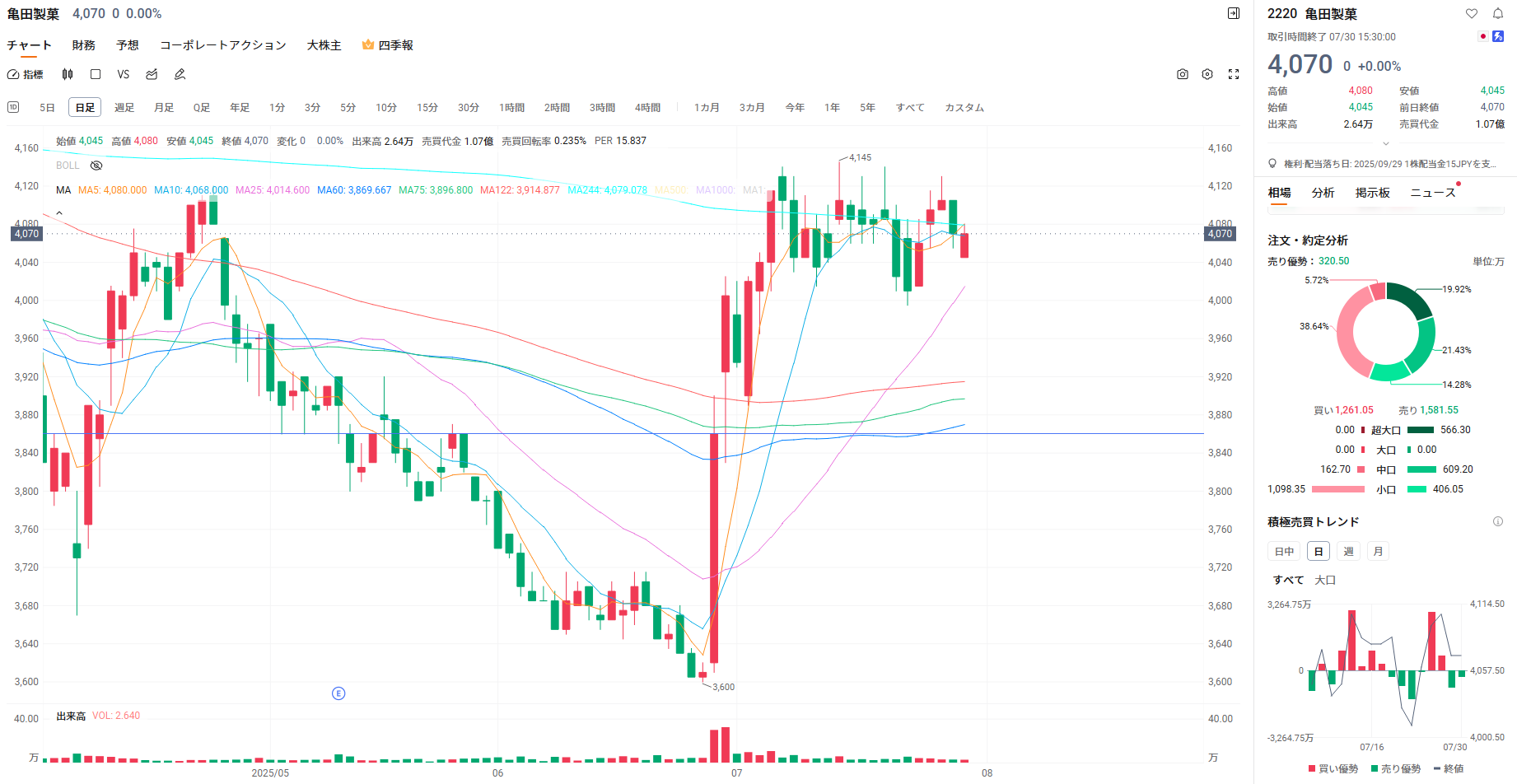 | 亀田製菓 | 카메다세이과 | 2220 | 2025월 6월 27일 금 | ¥3,860 | ¥4,070 | 5.4% |