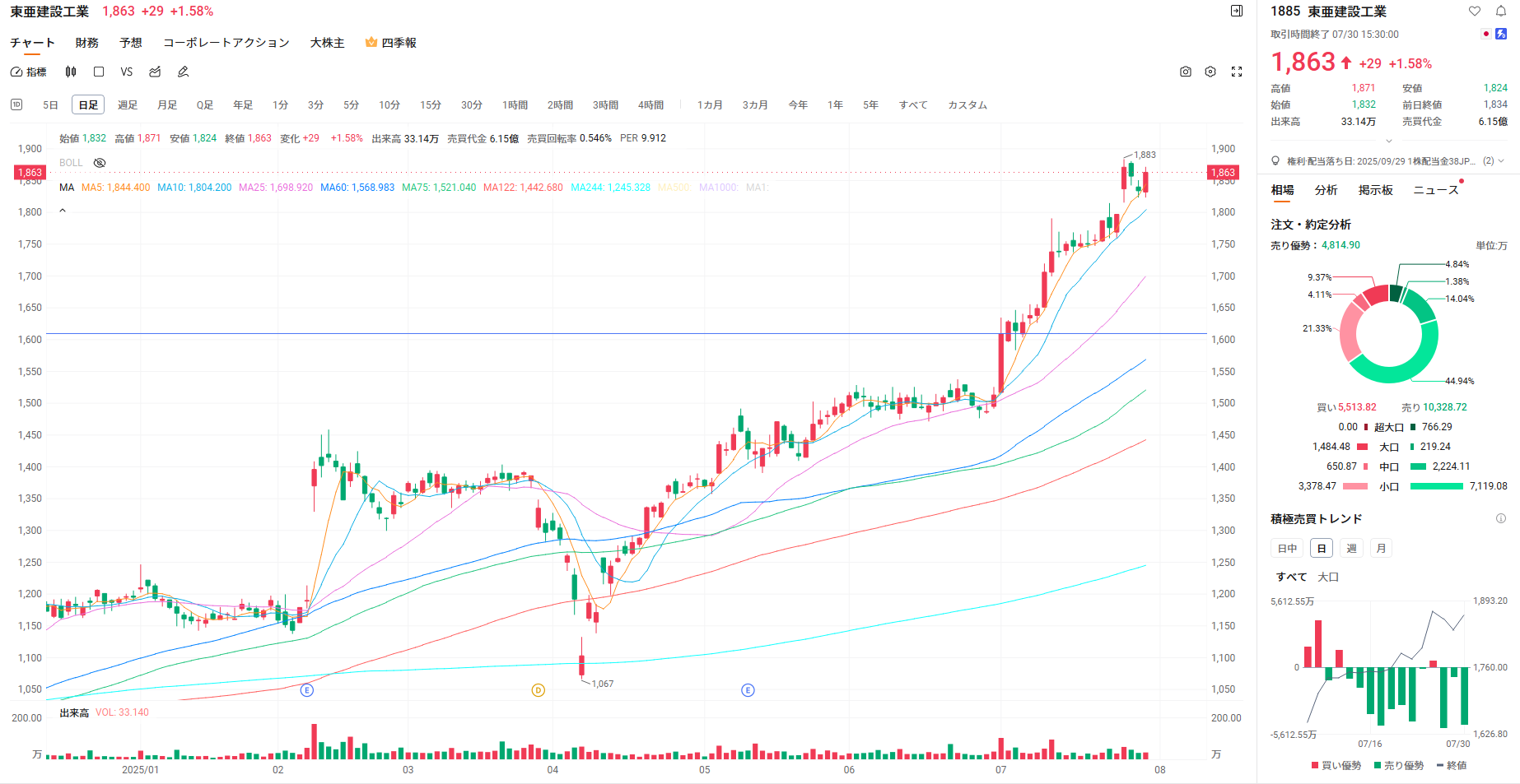 | 東亜建設工業 | 토아켄세쯔코교 | 1885 | 2025년 7월 1일 화 | ¥1,550 | ¥1,863 | 20.2% |