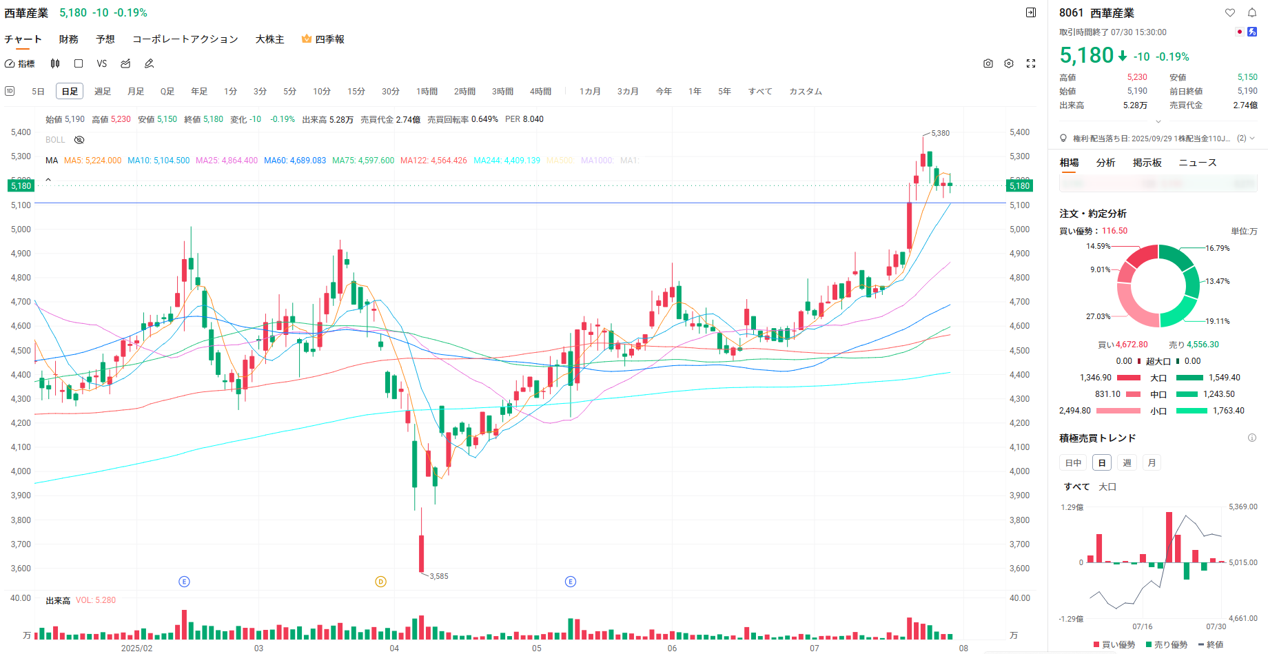 | 西華産業 | 세이카산교 | 8061 | 2025년 7월 22일 | ¥5,110 | ¥5,180 | 1.4% |