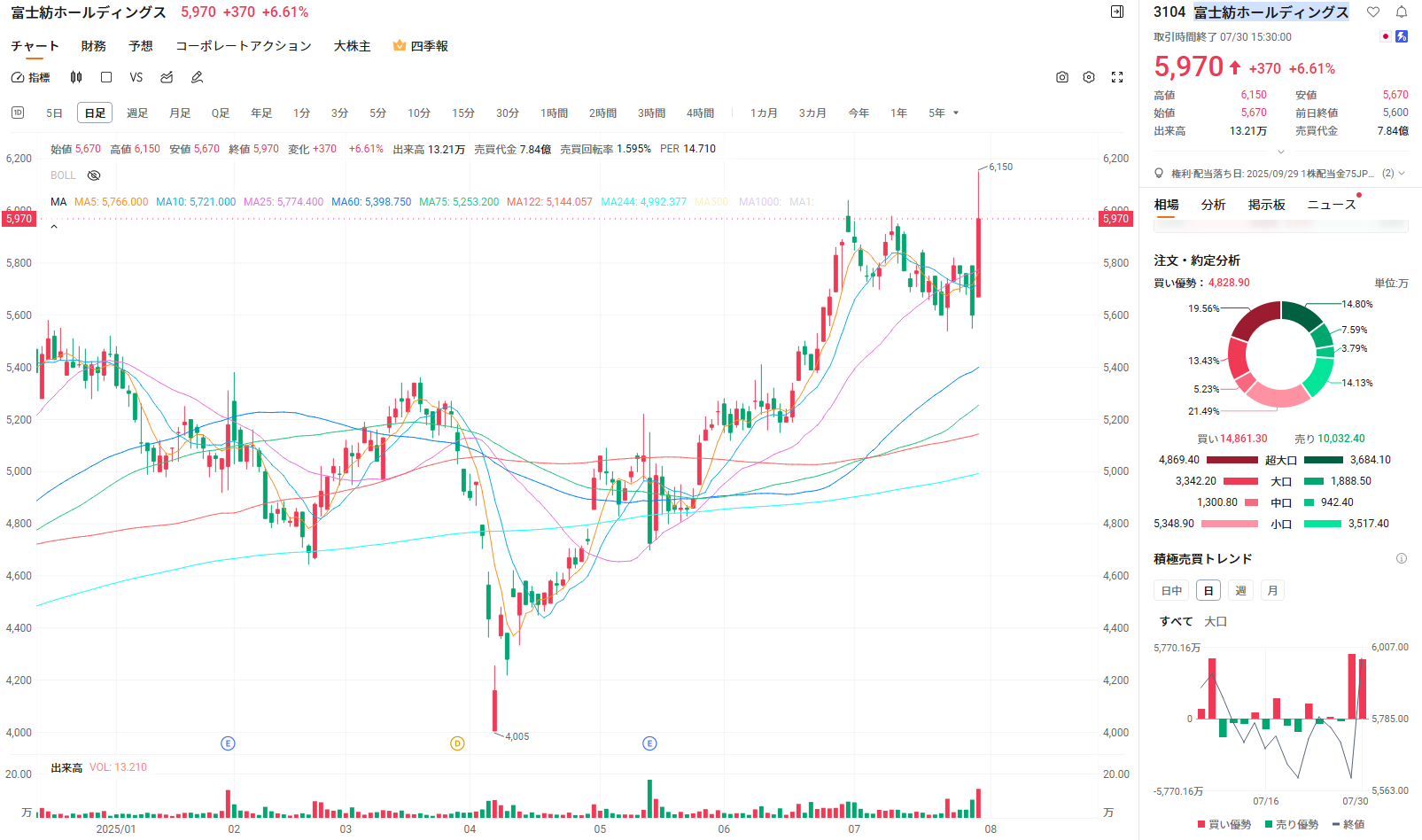 | 富士紡ホールディングス | 후지보홀딩스 | 3104 | 2025년 7월30일 | ¥5,970 | ||
