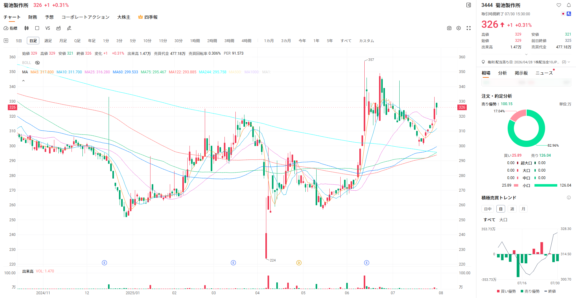 | 菊池製作所 | 키쿠치세이사쿠죠 | 3444 | 2025년 7월29일 | ¥325 | ¥326 | 0.3% |